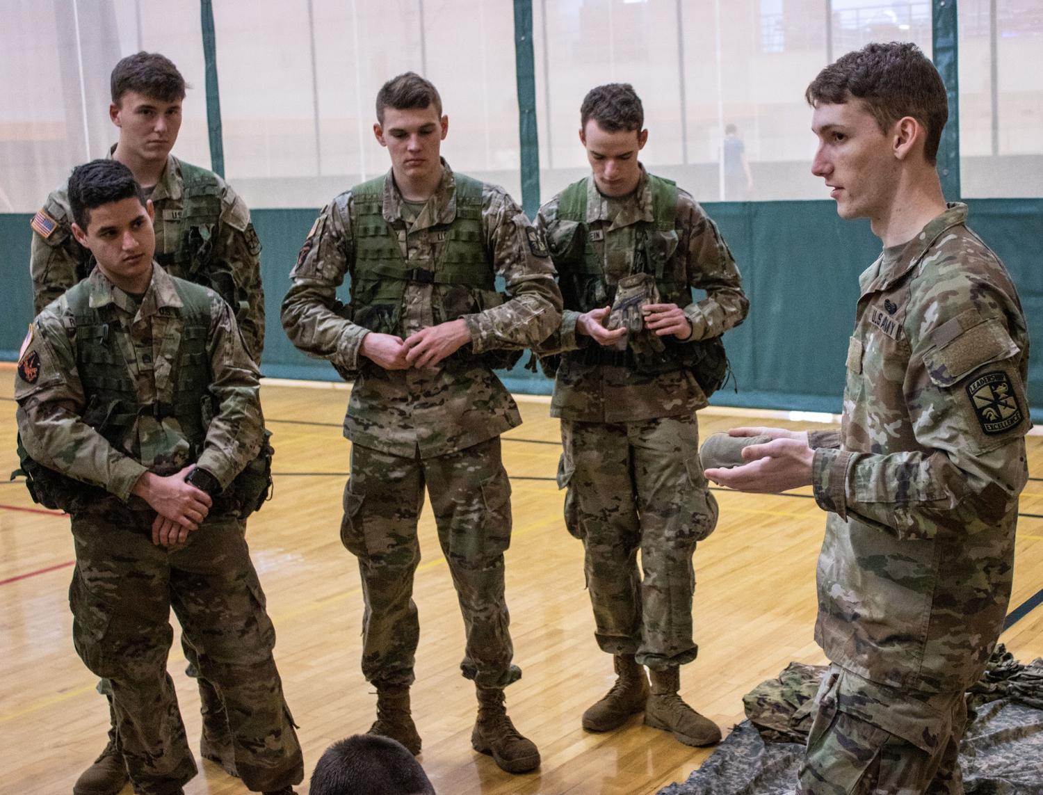 Cadet Sepinuck instructs first and second year cadets on how to ranger roll green tees.